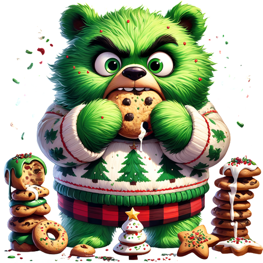 A cute, green bear character in a festive sweater enjoys a cookie surrounded by a variety of colorful holiday treats.DTF Transfers dtf transfers
