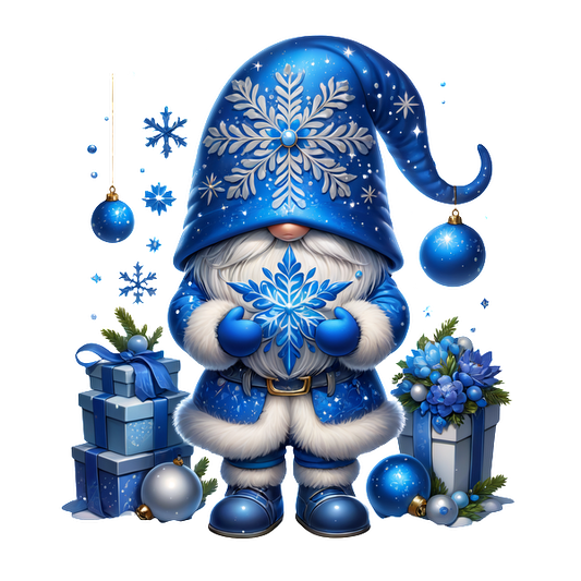 A cheerful blue gnome holds a snowflake, surrounded by festive ornaments and presents, capturing a whimsical winter spirit.DTF Transfers heat press transfers