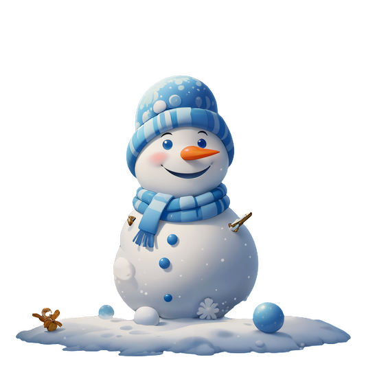 A cheerful cartoon snowman adorned with a blue scarf and hat, standing playfully in a snowy landscape.DTF Transfersdtf regular iron