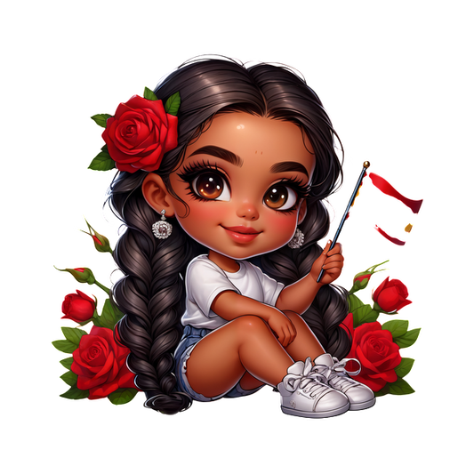 Regular price From £0.75 GBPRegular priceUnit price / per£2.39 GBPSale price From £0.75 GBPA cute, cartoon-style girl with braided hair, wearing a white shirt and denim shorts, surrounded by red roses.DTF Transfers heat press transfers