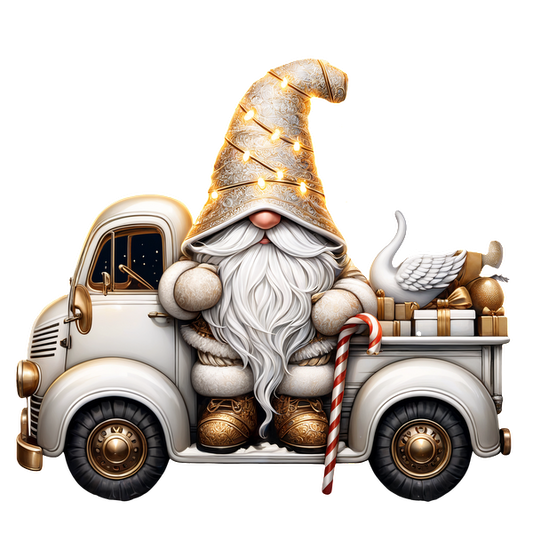 A whimsical gnome in a golden hat sits in a vintage white truck, surrounded by gifts and festive decorations.DTF Transfers dtf transfers