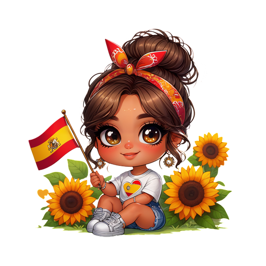 Regular price From £0.75 GBPRegular priceUnit price / per£2.39 GBPSale price From £0.75 GBPA cheerful girl with a Spanish flag poses among vibrant sunflowers, wearing a cute outfit and a colorful headband.DTF Transfers dtf prints