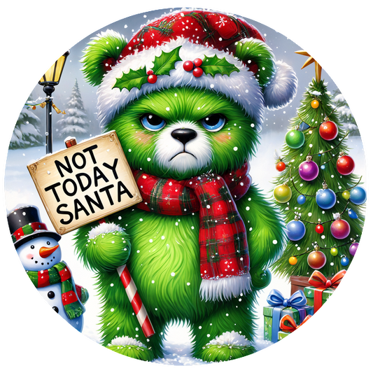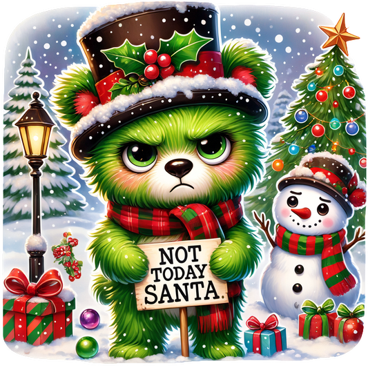 A grumpy green bear in a festive top hat and scarf holds a sign saying "NOT TODAY SANTA!" amidst a snowy holiday scene.DTF Transfers heat press transfers