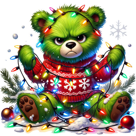 A playful green bear wearing a festive red sweater is tangled in colorful Christmas lights, bringing a humorous holiday spirit.DTF Transfers dtf prints