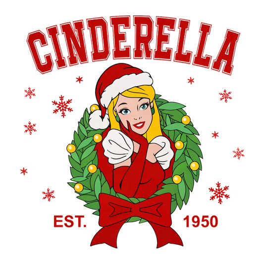 A festive graphic featuring Cinderella in a Santa hat surrounded by a Christmas wreath, established in 1950.DTF Transfers dtf prints