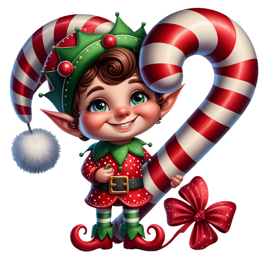 A cheerful cartoon elf in festive attire, holding a large striped candy cane, spreads holiday joy with a big smile.DTF Transfers heat press transfers