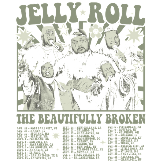Promotional poster for Jelly Roll's "The Beautifully Broken" tour, featuring vibrant graphics and a schedule of tour dates.DTF Transfers heat press transfers