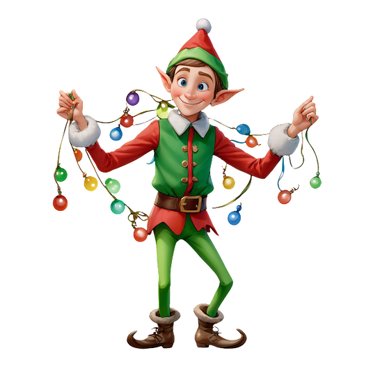 Cheerful cartoon elf in festive attire, holding colorful Christmas lights, ready to spread holiday cheer and joy!DTF Transfers dtf prints