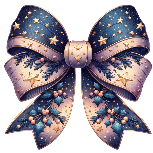 A festive bow featuring a rich blend of blue and gold tones, adorned with stars and holly leaves.dtf regular iron