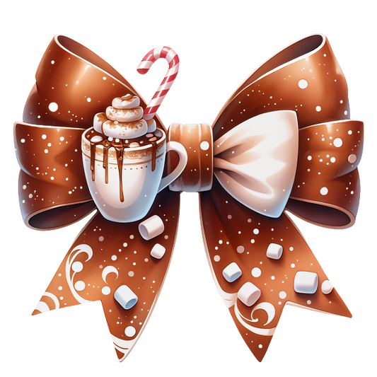 A whimsical chocolate ribbon bow featuring a cup of hot cocoa topped with whipped cream and a candy cane. dtf prints