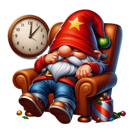 Regular price From £0.75 GBPRegular priceUnit price / per£2.39 GBPSale price From £0.75 GBPA cozy cartoon gnome in a red hat, napping in an armchair next to a clock and festive decorations.dtf regular iron