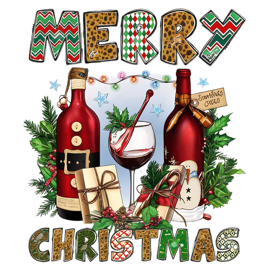 Festively decorated for the holidays, this image features two bottles of wine, a glass, gifts, and vibrant "Merry Christmas" lettering. dtf prints