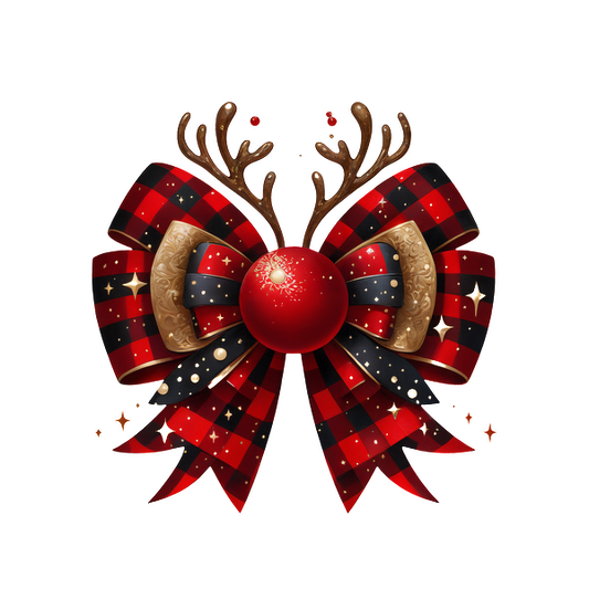 A festive red and black plaid bow adorned with antlers and a shiny ornament, perfect for holiday decorations! dtf transfers