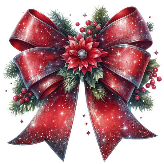 A festive red bow adorned with a vibrant poinsettia and greenery, perfect for holiday decorations.dtf regular iron