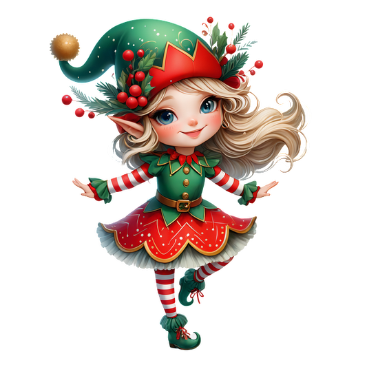 A cheerful elf character in a festive green and red outfit, adorned with holly, captivatingly poses with joy.DTF Transfers dtf transfers