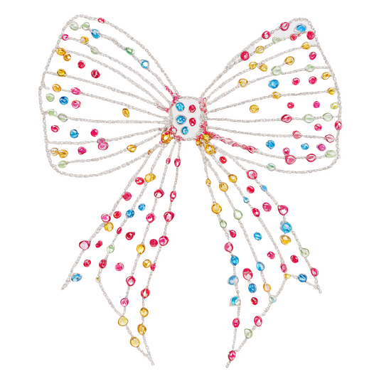 A colorful jeweled bow with radiant patterns, featuring vibrant pink, blue, and yellow stones, perfect for festive occasions. dtf prints