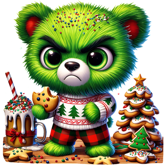 Regular price From £0.75 GBPRegular priceUnit price / per£2.39 GBPSale price From £0.75 GBPMeet the adorable yet grumpy green teddy bear, dressed in a festive sweater, holding a cookie beside holiday treats!DTF Transfers dtf transfers