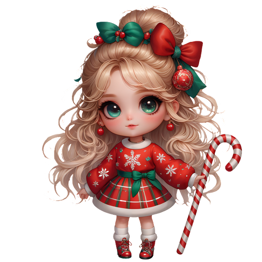 A charming Christmas doll with curly blond hair, festive attire, and a candy cane, radiating holiday cheer and joy.DTF Transfers dtf prints