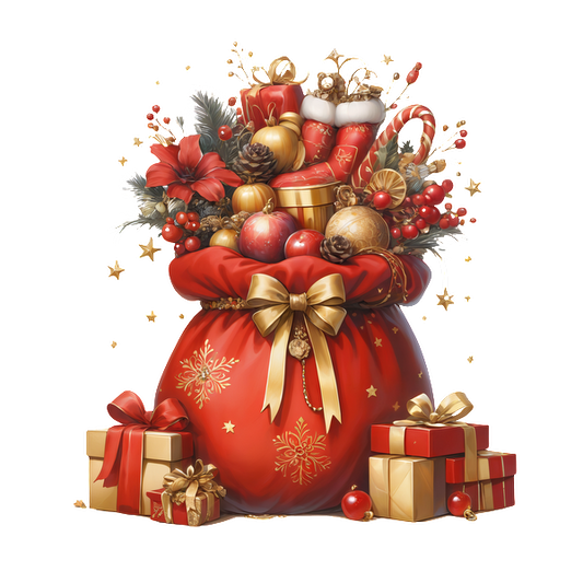 A festive red sack filled with colorful ornaments, candy canes, and gifts, perfect for the holiday season. dtf prints