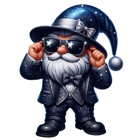 This whimsical gnome features a sparkly silver suit and a starry hat, complete with sunglasses for a stylish touch.