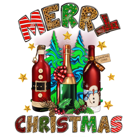 Festive illustration featuring three creatively decorated bottles with a "Merry Christmas" message and holiday-themed elements. dtf prints