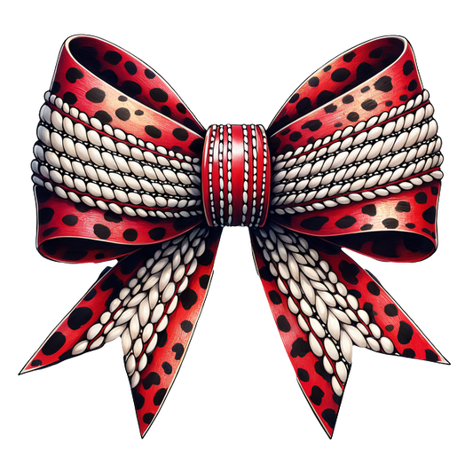 A vibrant red and black spotted bow with intricate braided detailing, perfect for festive decorations or stylish accessories. dtf transfers