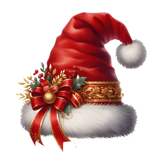 Regular price From £0.75 GBPRegular priceUnit price / per£2.39 GBPSale price From £0.75 GBPA festive red Santa hat adorned with elegant golden trim, a fluffy white brim, and decorative greenery and ribbon accents. dtf prints