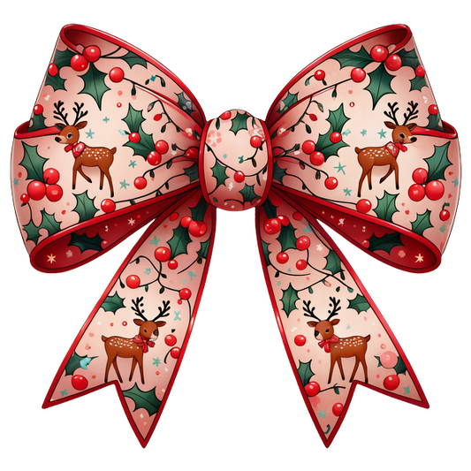 Festively designed bow featuring reindeer and holly, perfect for holiday decorations or gift wrapping. heat press transfers