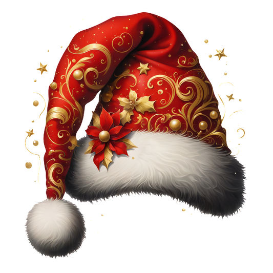Regular price From £0.75 GBPRegular priceUnit price / per£2.39 GBPSale price From £0.75 GBPFestively adorned, this red Santa hat features intricate golden swirls, a fluffy white trim, and a charming poinsettia decoration. heat press transfers