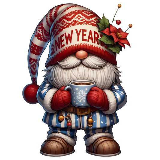 This cheerful gnome features a festive "New Year" hat, a striped blue outfit, red gloves, and a cup of warm drink.
