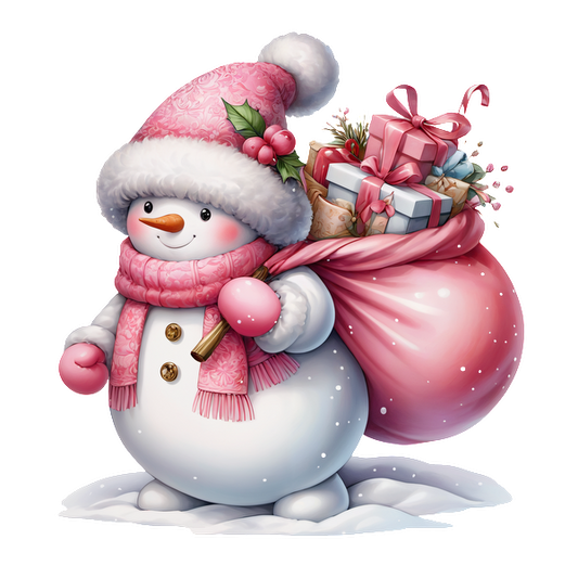 A cheerful snowman in a pink hat and scarf carries a sack filled with colorful gifts, spreading holiday joy. dtf transfers