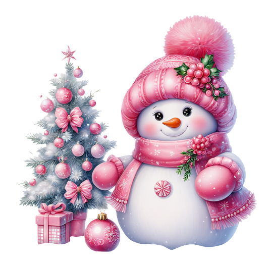 A cheerful snowman in a pink hat and scarf stands next to a decorated Christmas tree, surrounded by gifts and ornaments. heat press transfers