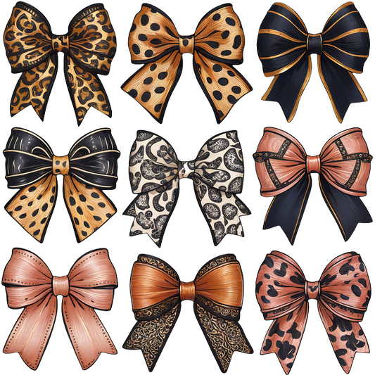 A stylish collection of nine decorative bows featuring various patterns like leopard print, polka dots, and elegant swirls.dtf regular iron