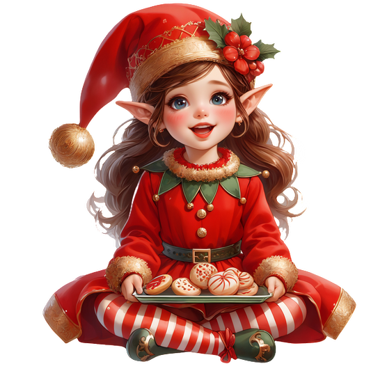 A cheerful elf girl in a red holiday outfit sits with a platter of decorated cookies, exuding festive charm.DTF Transfers dtf transfers