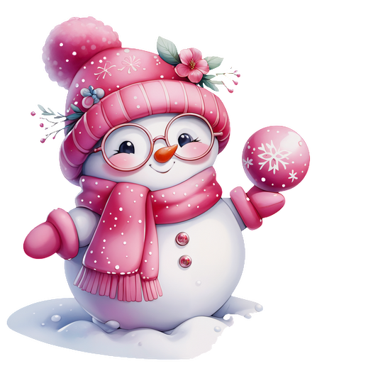 A cheerful snowman dressed in a pink scarf and hat, complete with glasses and holding a snowy pink ornament.dtf regular iron