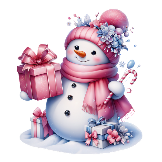 A cheerful snowman, adorned with a pink hat and scarf, holds gifts and a candy cane amidst a snowy backdrop. heat press transfers