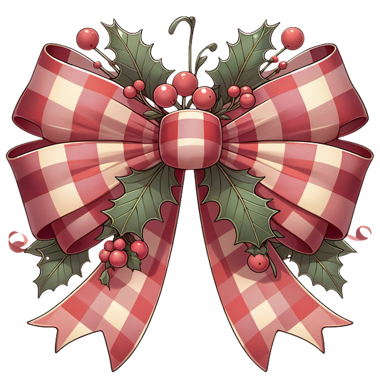 A festive red and white checkered bow adorned with holly and berries, perfect for holiday decorations. dtf transfers