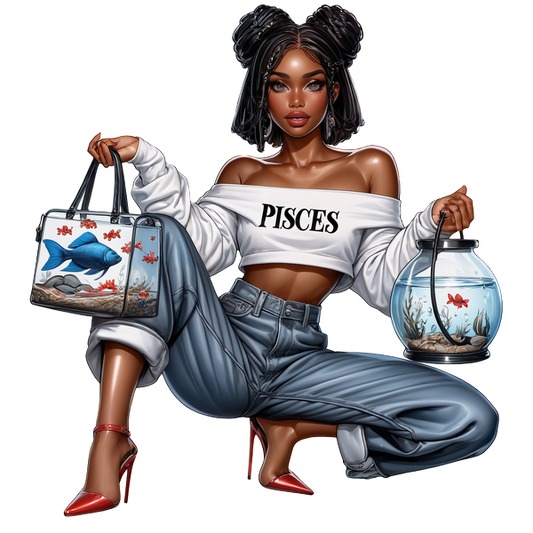 Regular price From £0.75 GBPRegular priceUnit price / per£2.39 GBPSale price From £0.75 GBPA fashionable young woman wearing a "Pisces" shirt and stylish red heels holds a fish-patterned bag and a fishbowl. dtf transfers