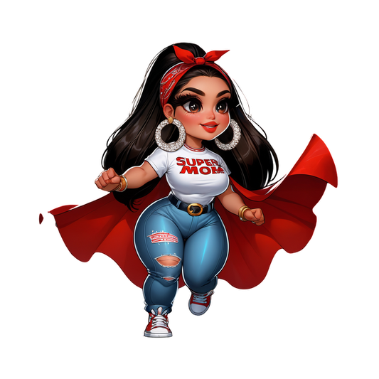 Regular price From £0.75 GBPRegular priceUnit price / per£2.39 GBPSale price From £0.75 GBPA confident superheroine with long hair in a red bandana, wearing a "SUPER MOM" shirt, distressed jeans, and a flowing cape. heat press transfers