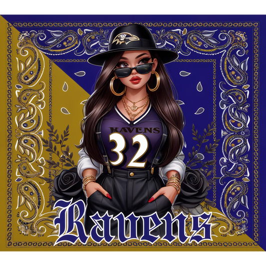 Regular price From £0.75 GBPRegular priceUnit price / per£2.39 GBPSale price From £0.75 GBPStylish fan art featuring a chic woman in Ravens gear, showcasing a black and purple color scheme with bold graphics.