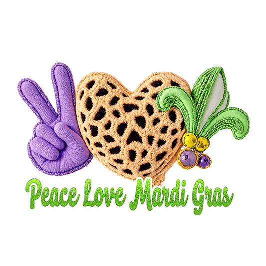 《3D chenille-like》Colorful Peace Love Mardi Gras sign featuring teal background and bold text."DTF Transfers