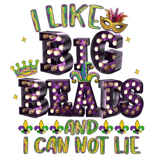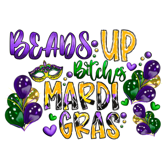 Celebrate Mardi Gras with this vibrant graphic featuring playful text, festive colors, and dazzling bead designs!DTF Transfers