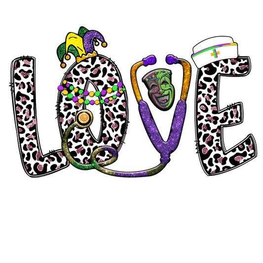 A cheerful and vibrant design featuring the word "LOVE" adorned with Mardi Gras decorations, a playful mask, and a stethoscope.DTF Transfers