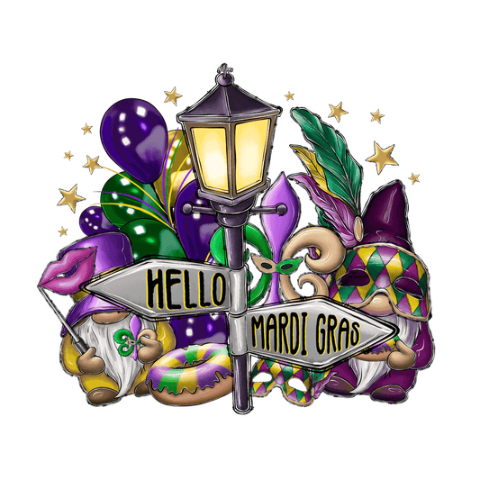 Celebrate Mardi Gras with this festive illustration featuring whimsical gnomes, vibrant beads, and a cheerful street sign adorned with colorful accents!DTF Transfers