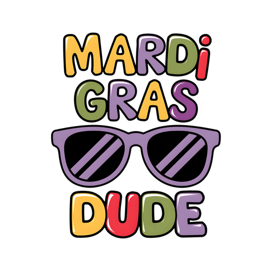 Celebrate Mardi Gras with this vibrant and playful graphic that features colorful text and stylish sunglasses!DTF Transfers