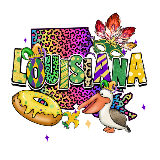 A vibrant and colorful design featuring "Louisiana" with iconic symbols like a pelican, donut, and Mardi Gras mask.DTF Transfers