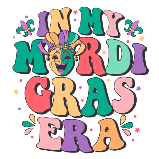 A colorful and playful design featuring the phrase "In My Mardi Gras Era," adorned with a jester mask and festive motifs.DTF Transfers