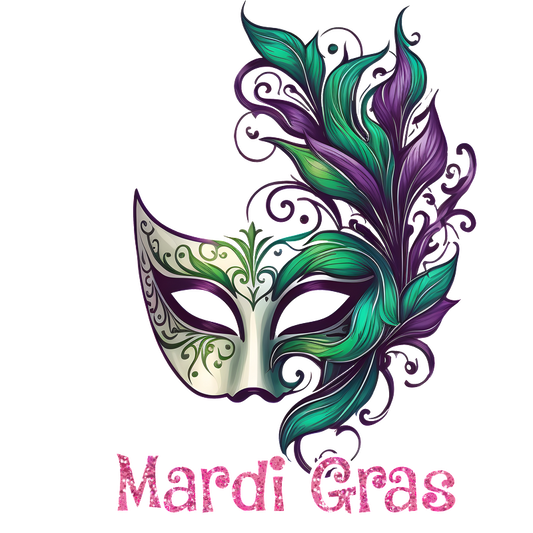 A beautifully designed Mardi Gras mask adorned with vibrant green and purple foliage, capturing the festive spirit of the celebration.DTF Transfers