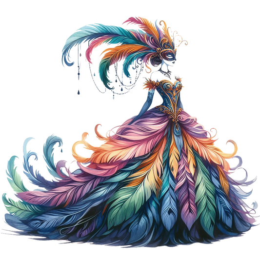 A stunning, colorful gown adorned with vibrant feathers, complemented by an ornate mask, exuding elegance and whimsical beauty.DTF Transfers