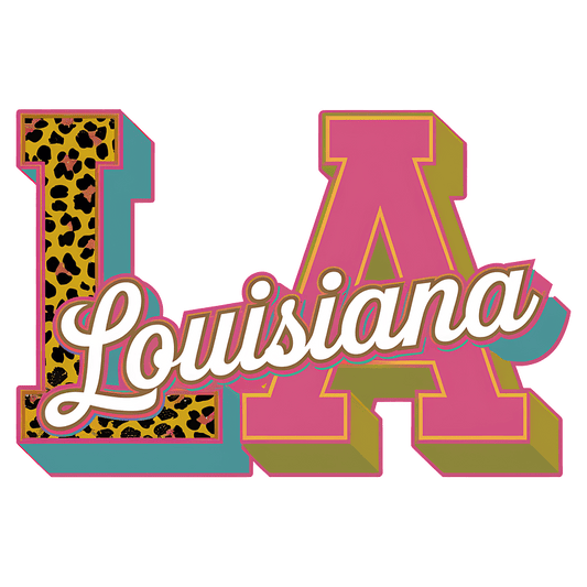 Colorful and stylish "I Louisiana" graphic featuring bold letters with leopard print and vibrant accents, perfect for showcasing Louisiana pride!DTF Transfers